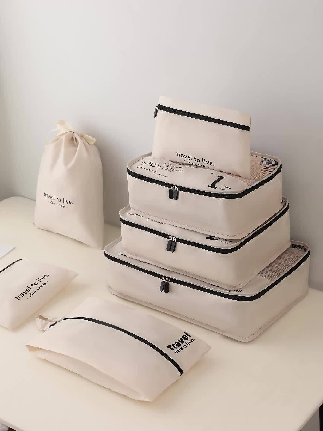 Ce set comprend 7 pièces distinctes : poches pour vêtements, poche pour sous-vêtements, poche pour chaussures, et autres pochettes assorties. Chaque élément est conçu pour optimiser l’espace dans votre valise.