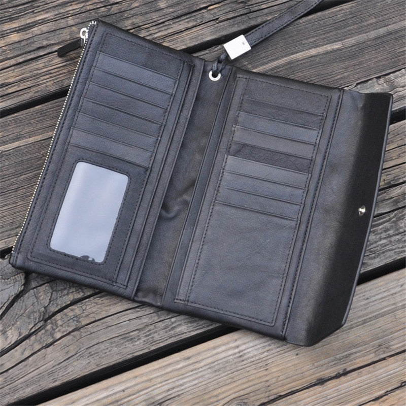 Ce portefeuille à main grand format combine style et organisation. Avec ses nombreux compartiments et sa taille généreuse, il accueille vos essentiels : cartes, billets, monnaie et même votre téléphone. Sophistiqué et pratique, il sublime vos sorties au quotidien.