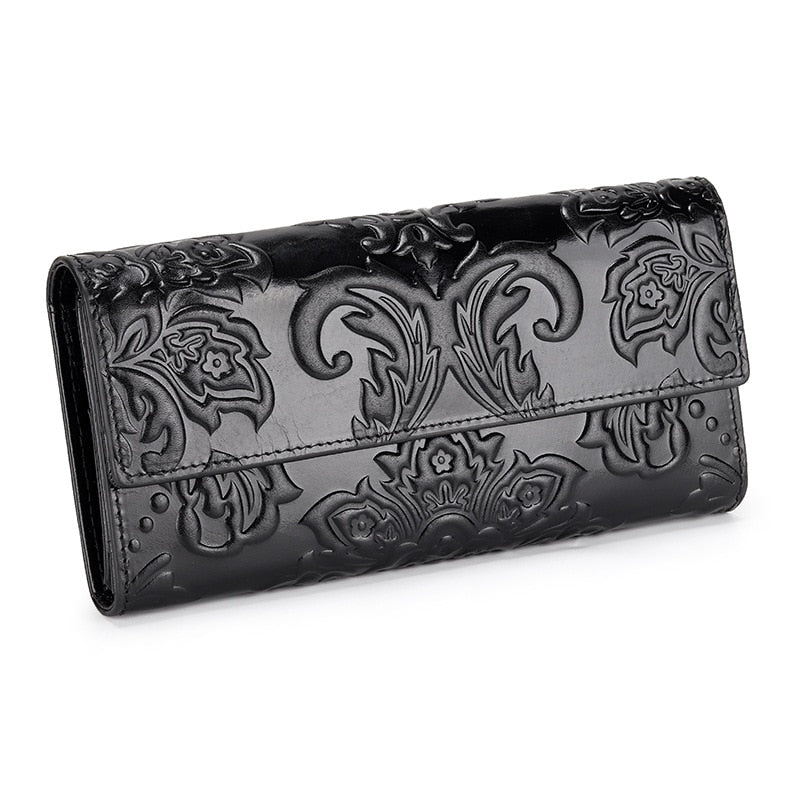 Les magnifiques motifs floraux embossés sur ce portefeuille témoignent d'un savoir-faire artisanal exceptionnel. Chaque fleur et arabesque est finement travaillée, créant un relief subtil qui capte la lumière de manière élégante. Le fermoir métallique de haute qualité ajoute une touche finale sophistiquée, assurant sécurité et style à votre accessoire préféré. Laissez-vous séduire par ces détails uniques qui font toute la différence.